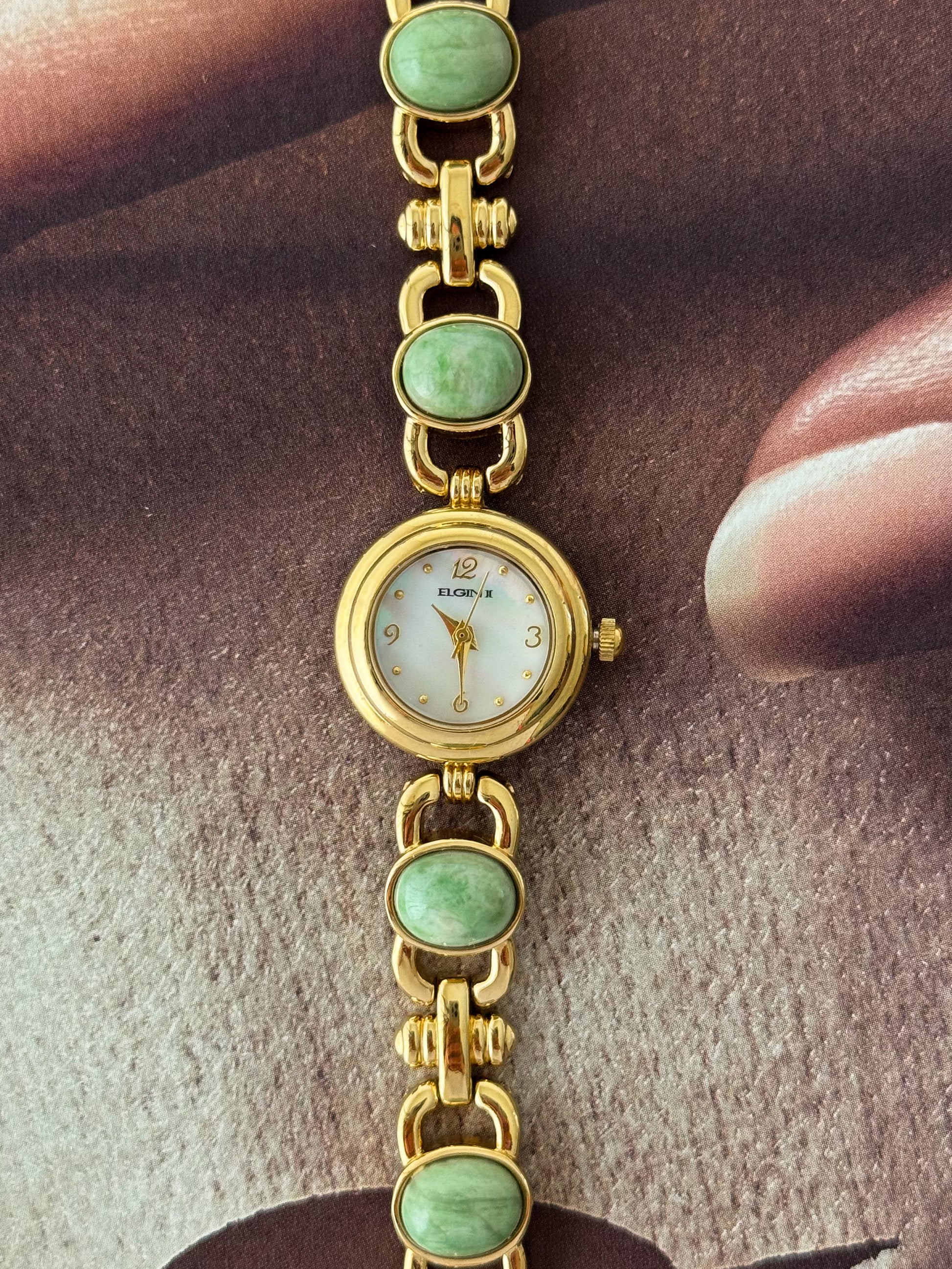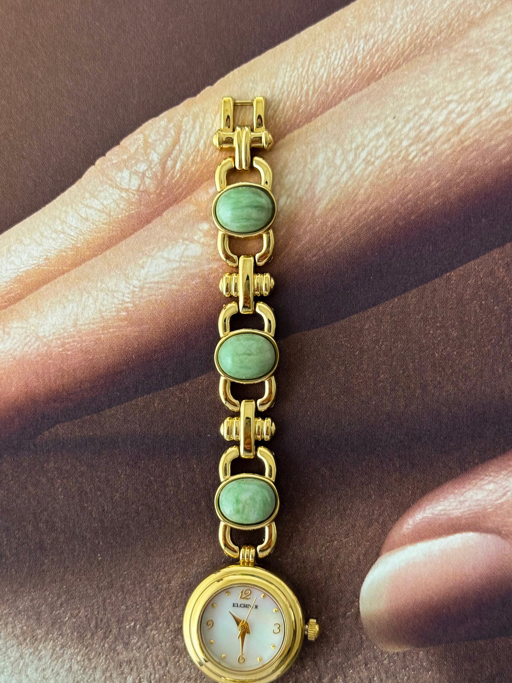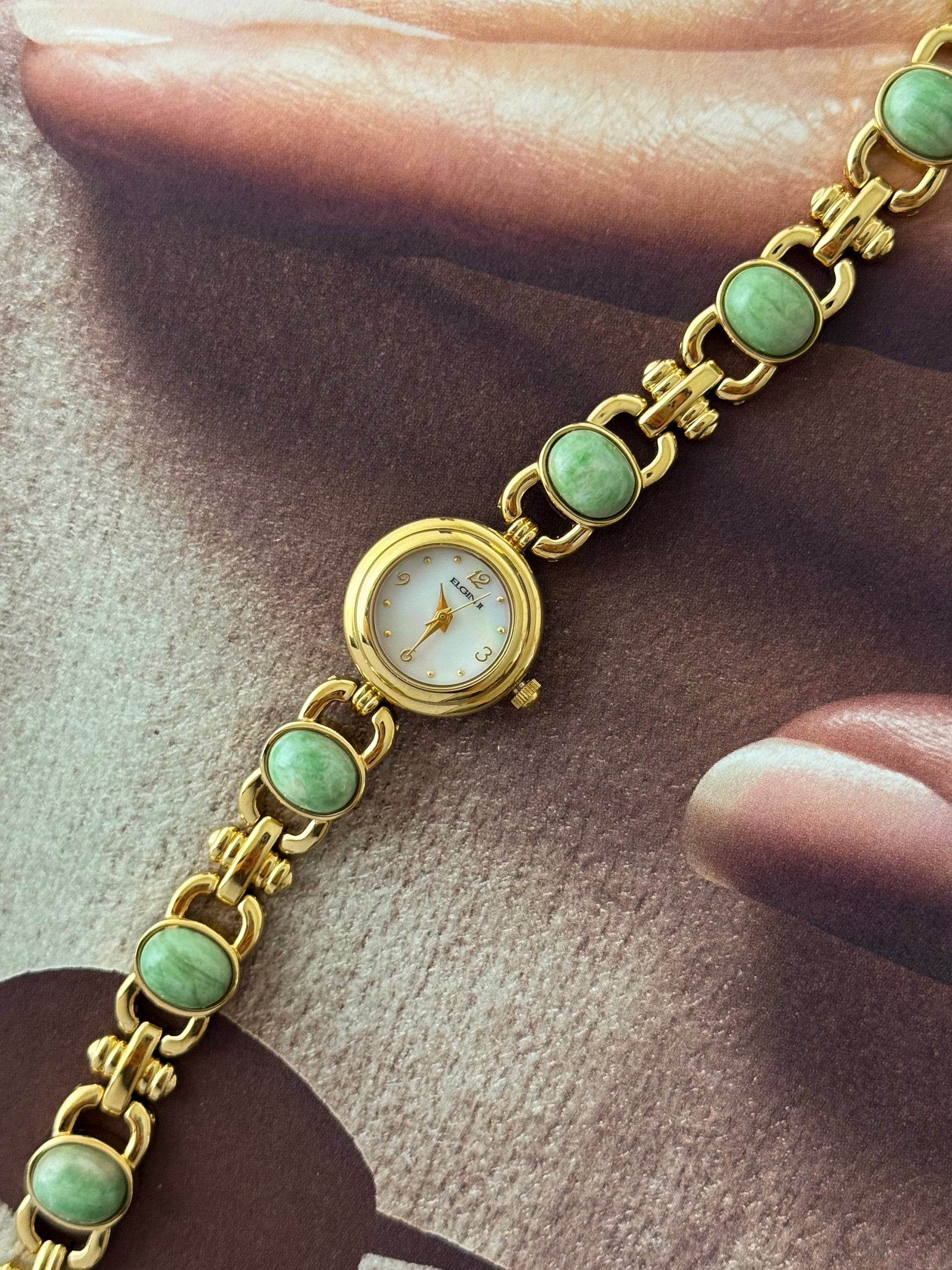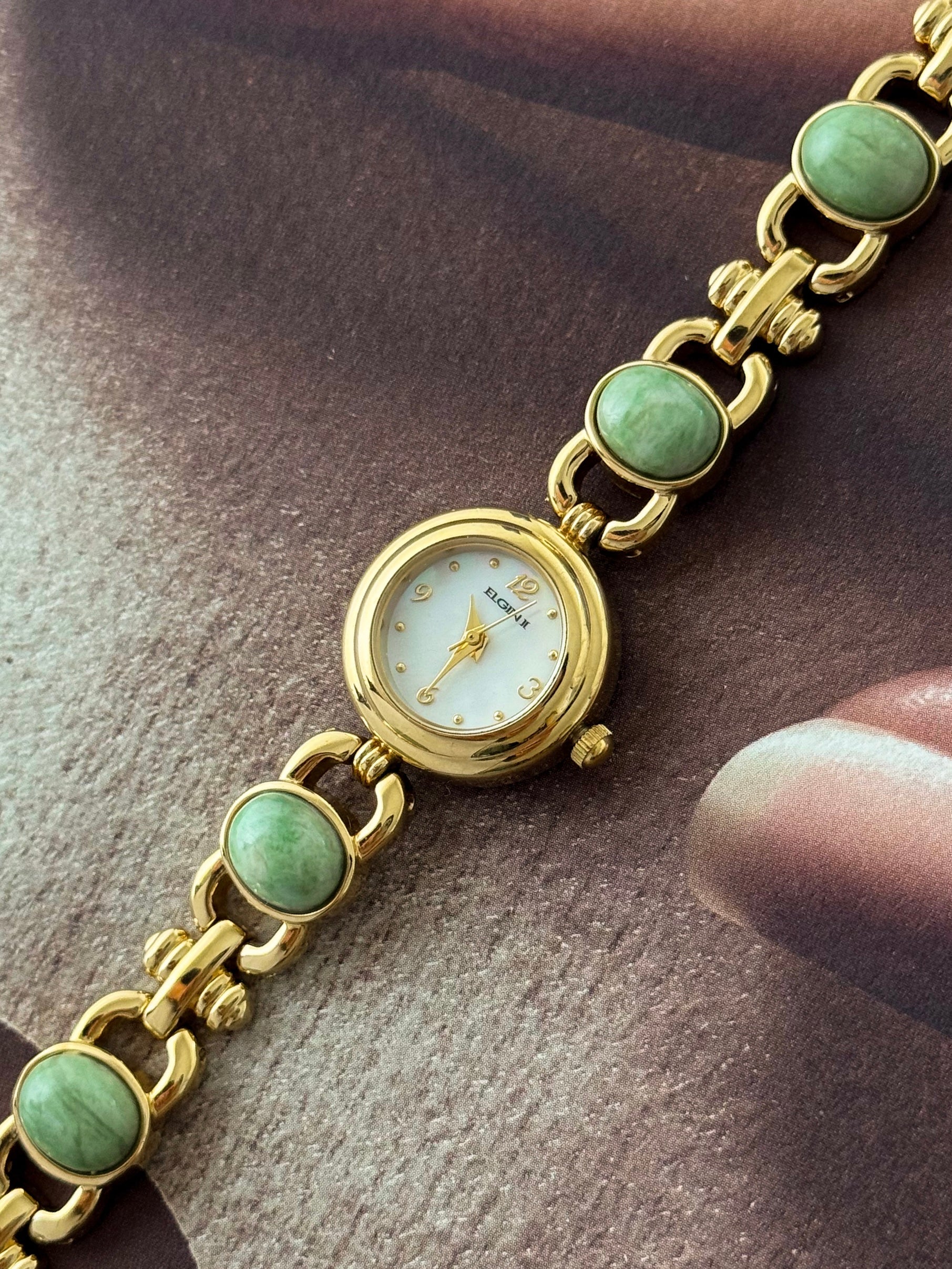 Vintage Elgin Gold Watch With Natural Jade Stone Band
