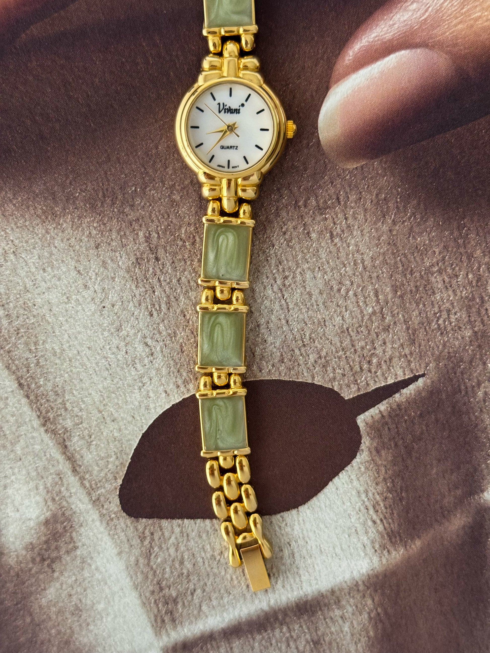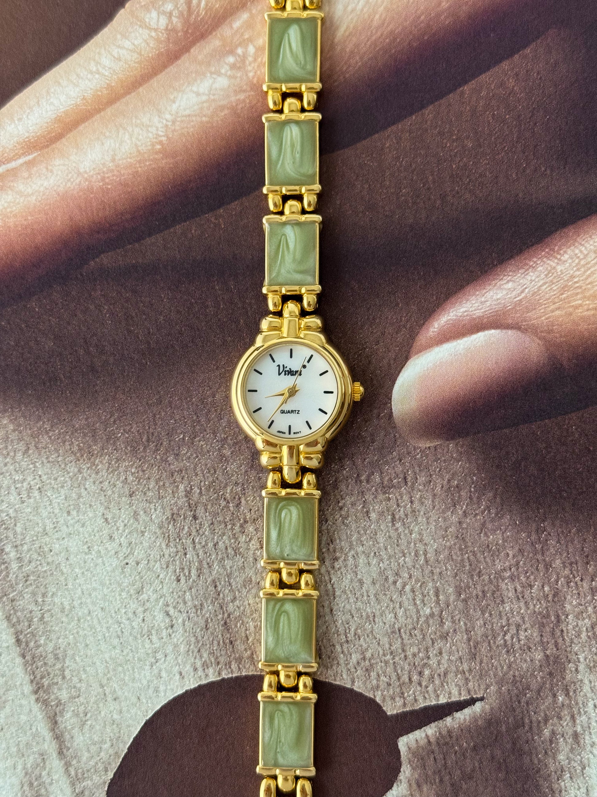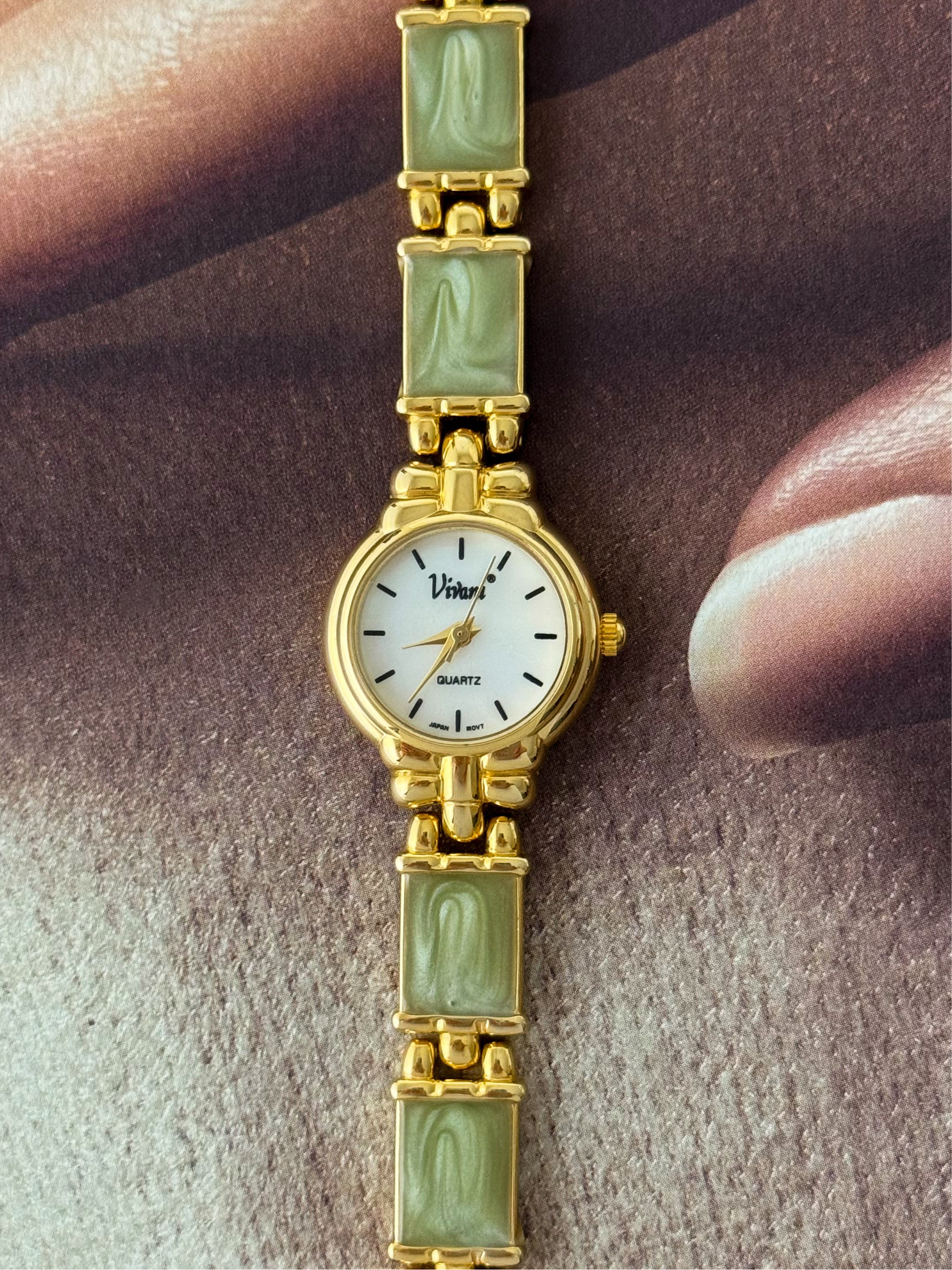 Vintage Vivani Gold Watch With Swirl Green Stone Band