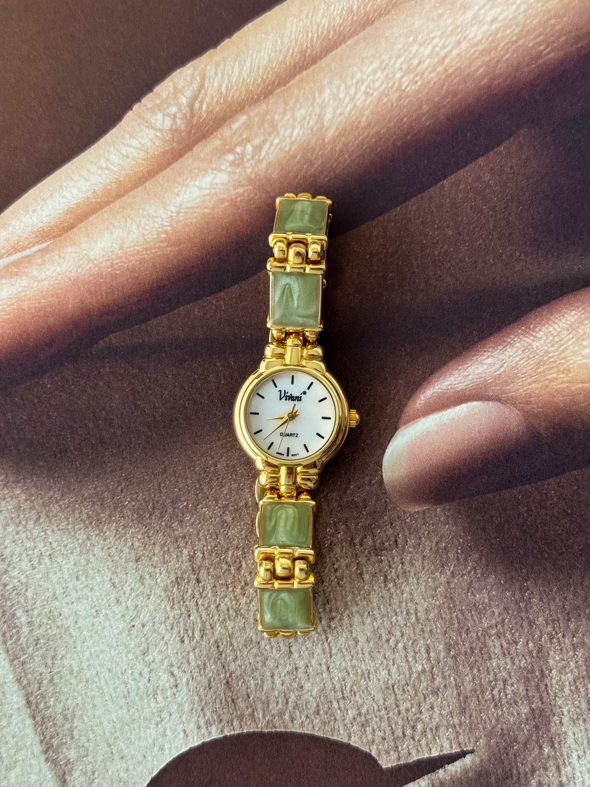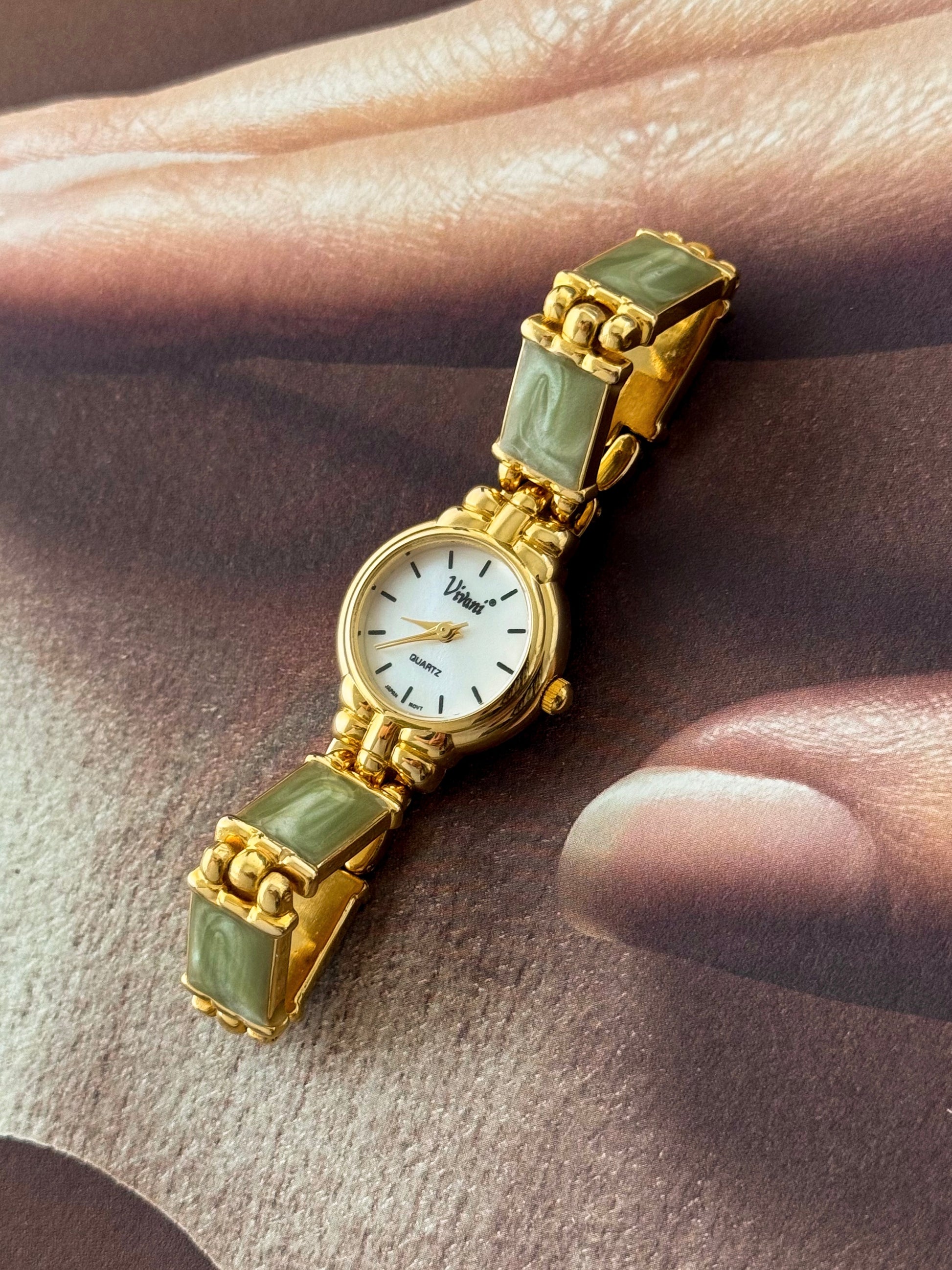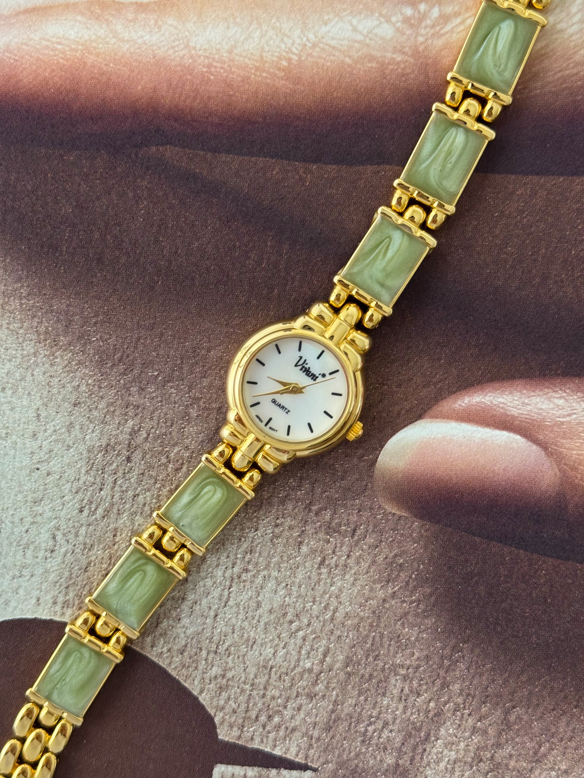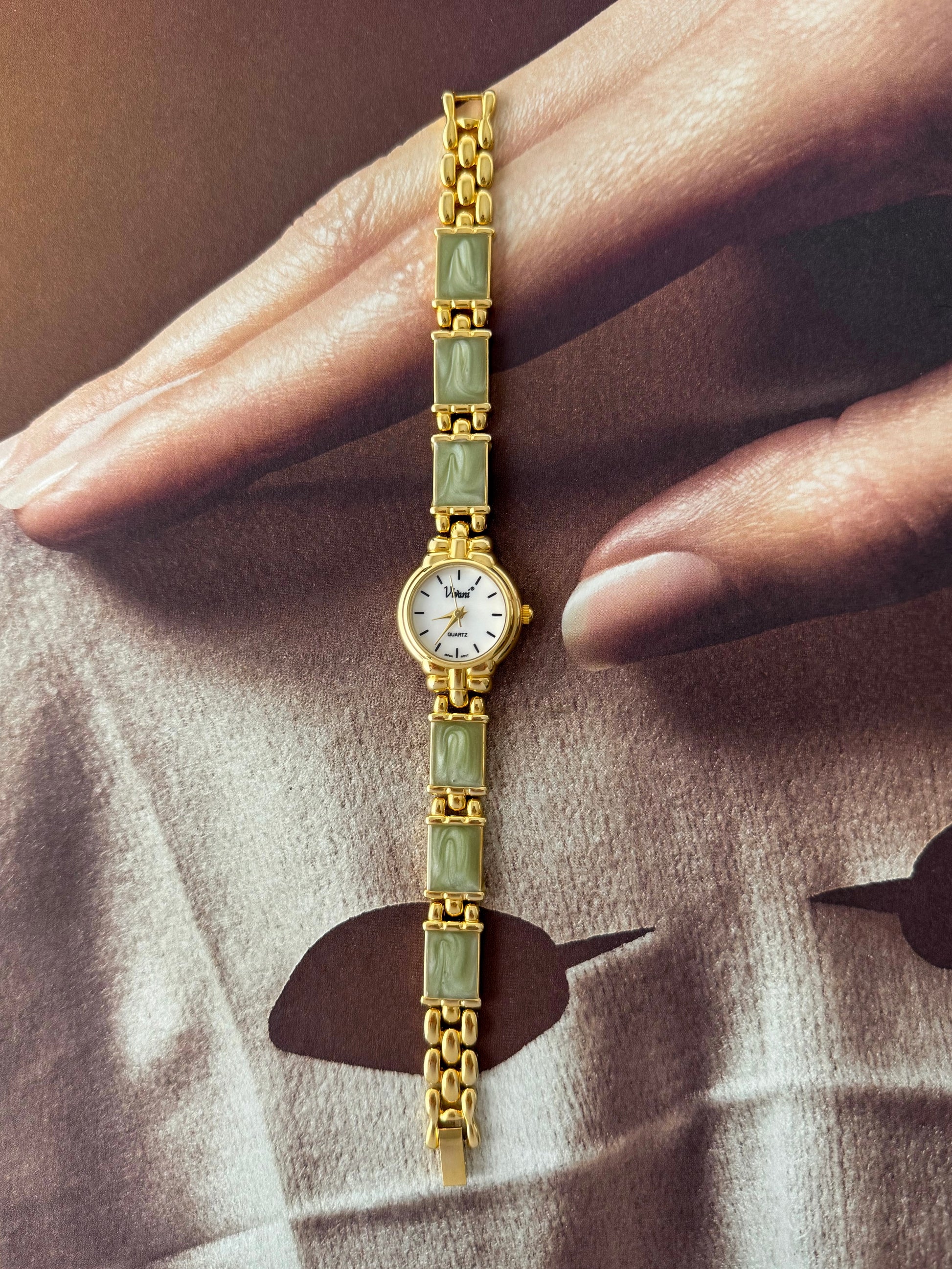 Vintage Vivani Gold Watch With Swirl Green Stone Band