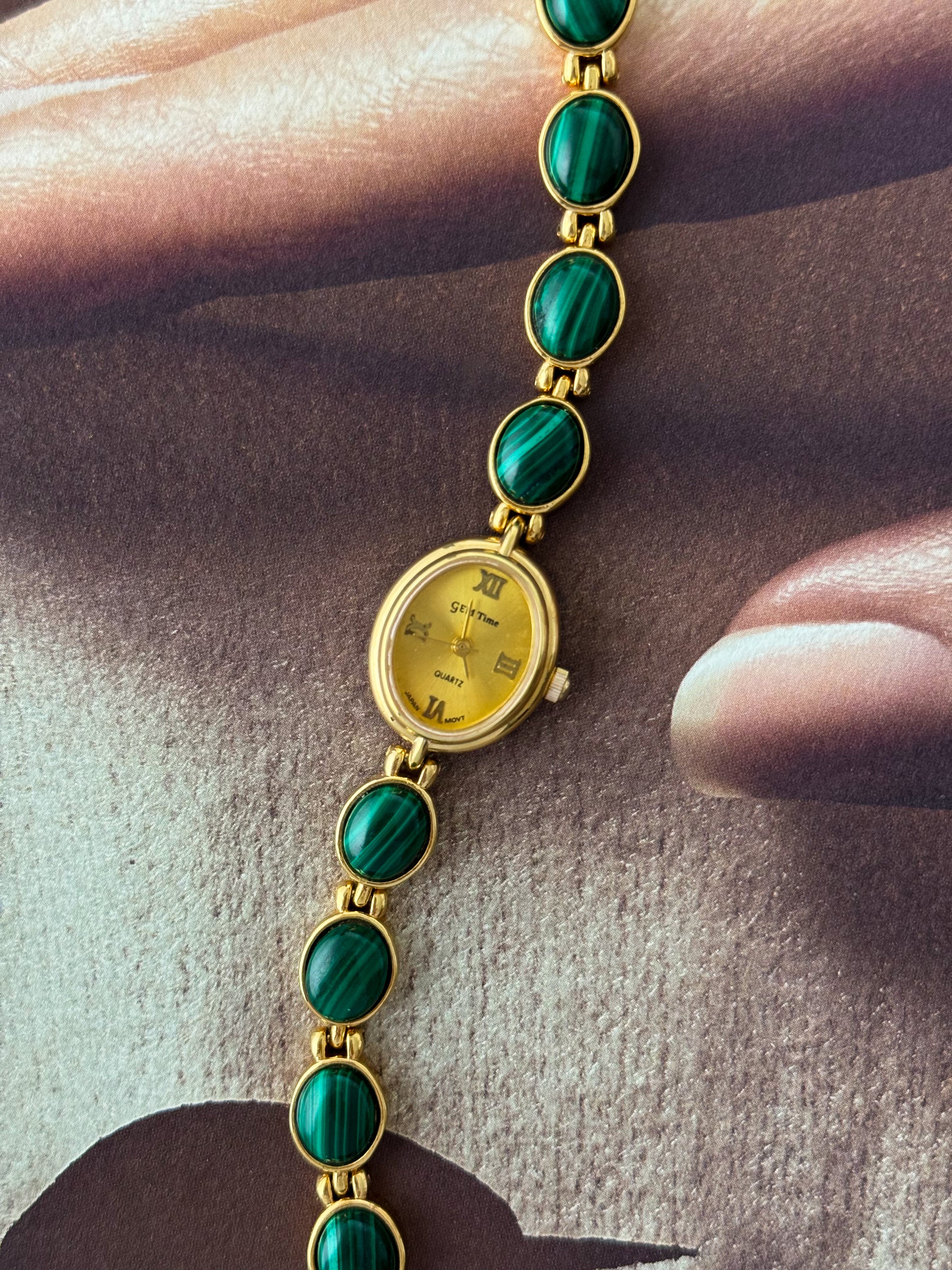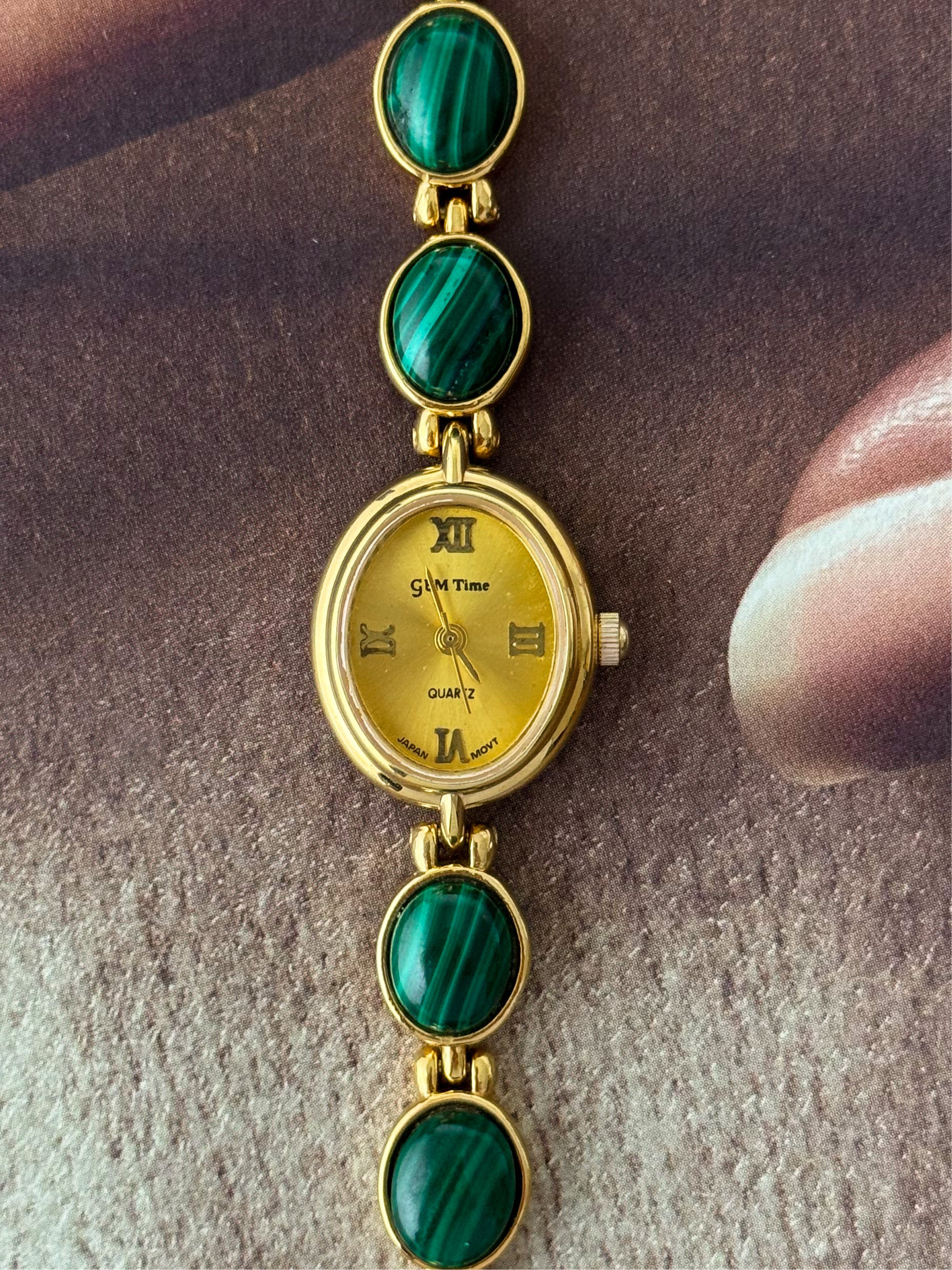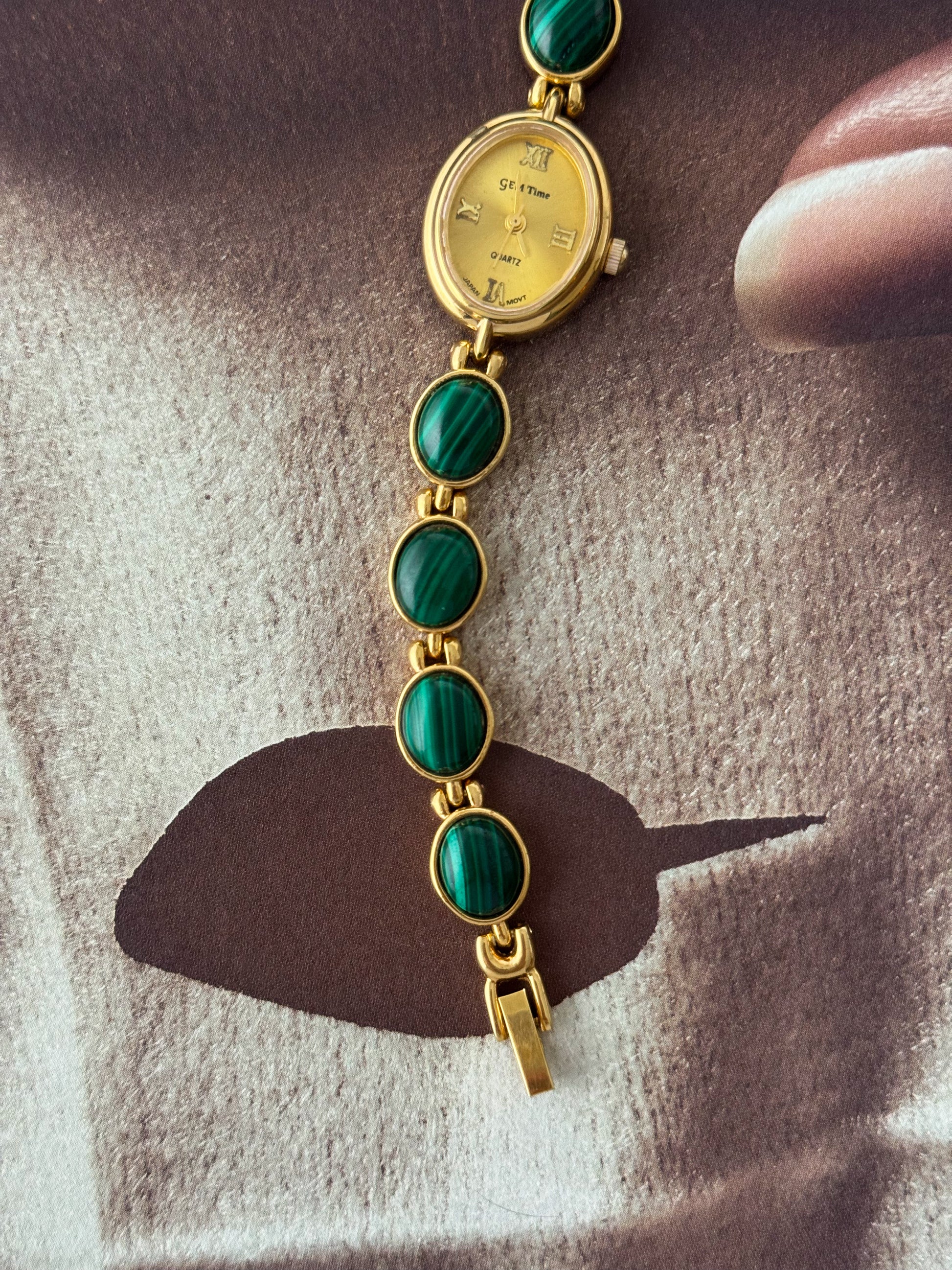 Vintage Gem Time Gold Watch With Malachite Stone Band