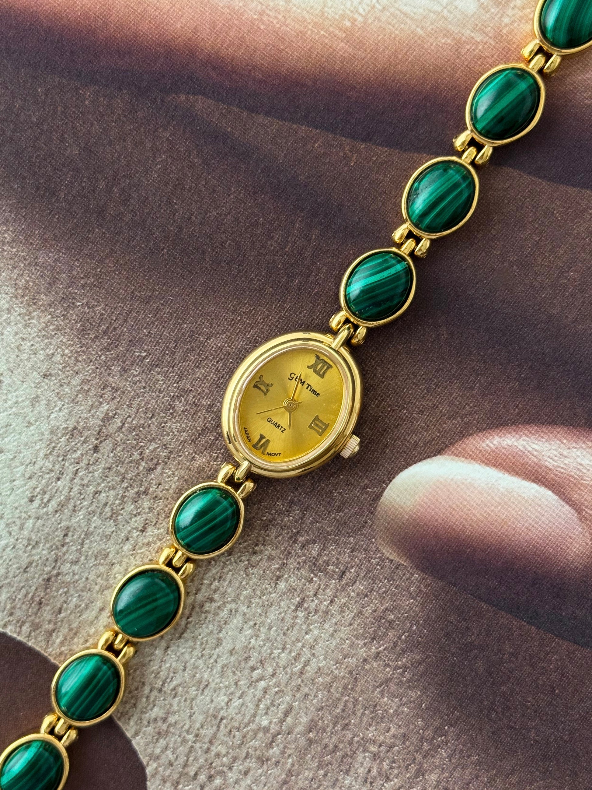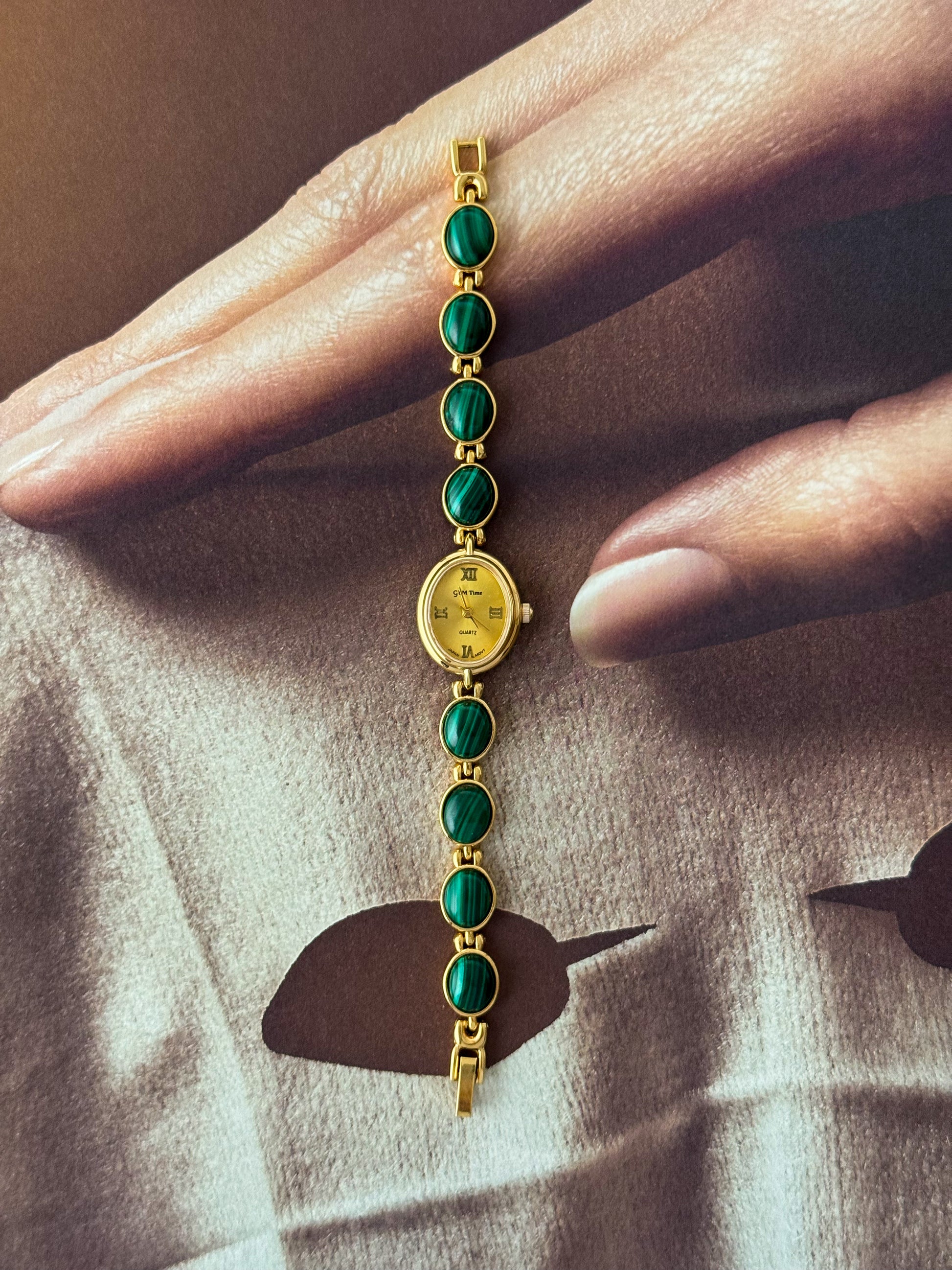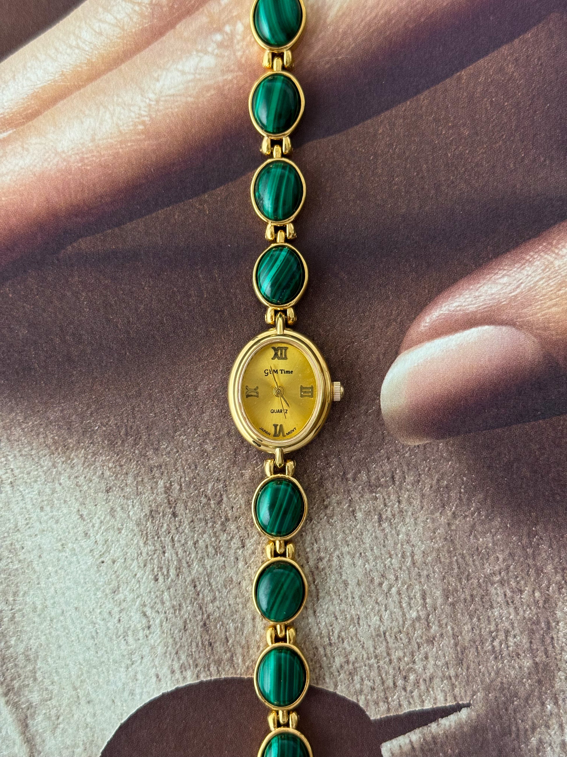 Vintage Gem Time Gold Watch With Malachite Stone Band