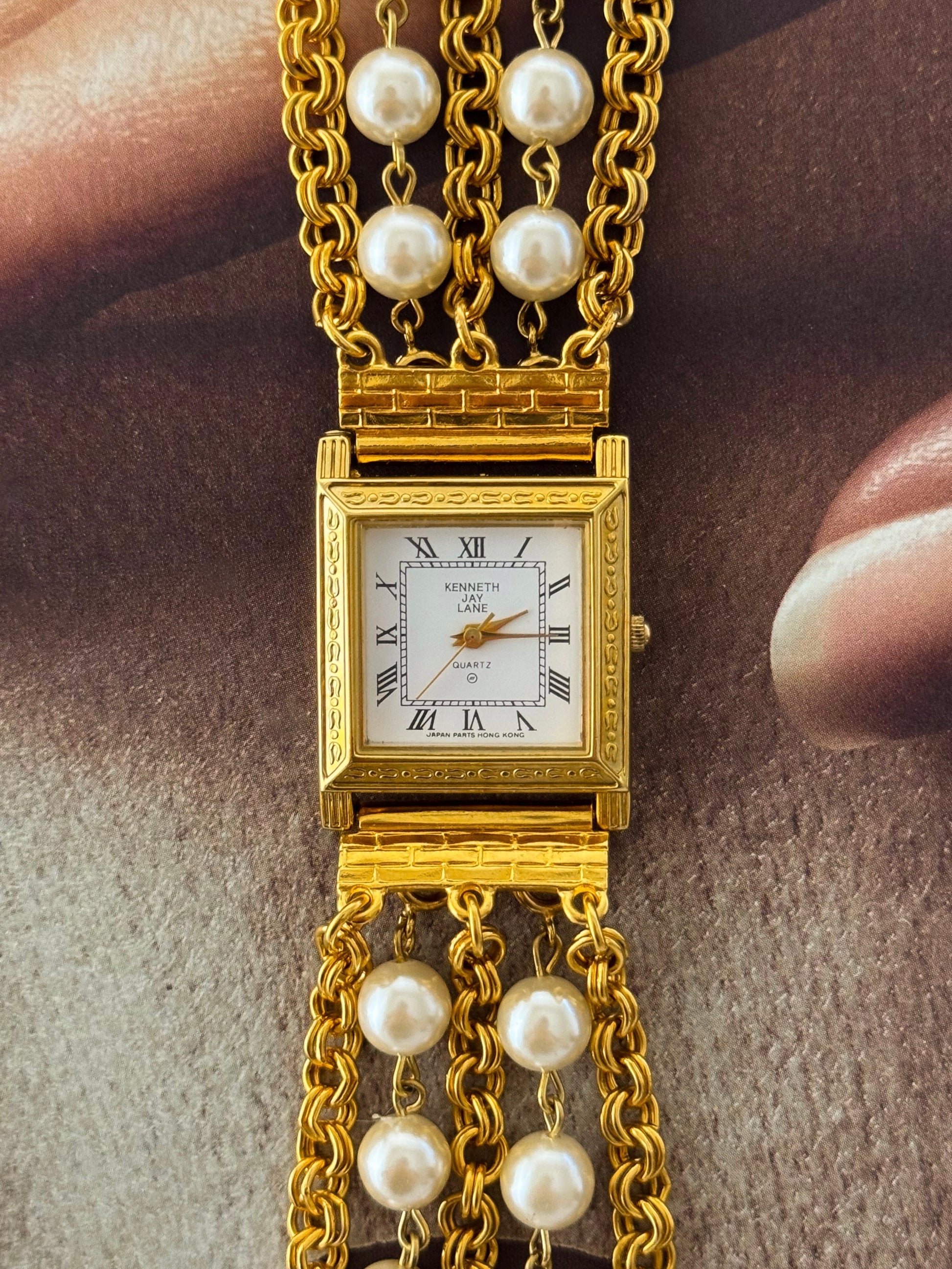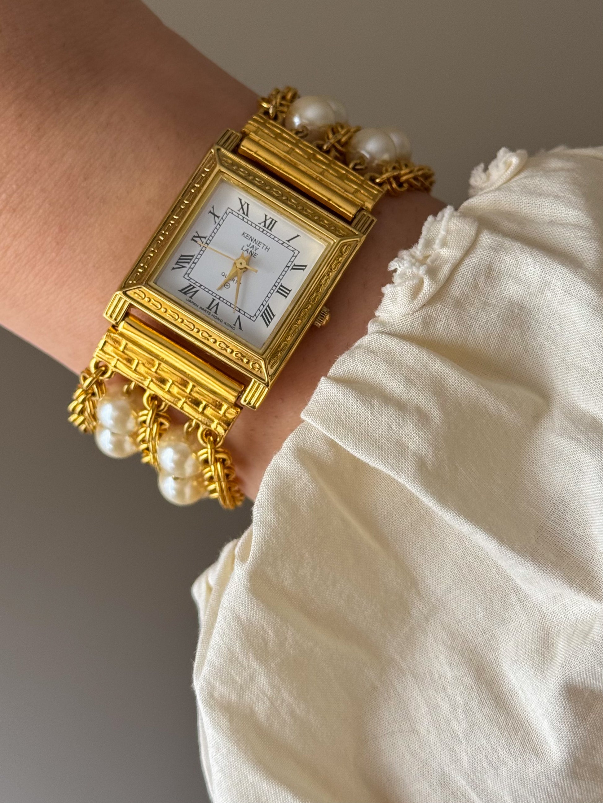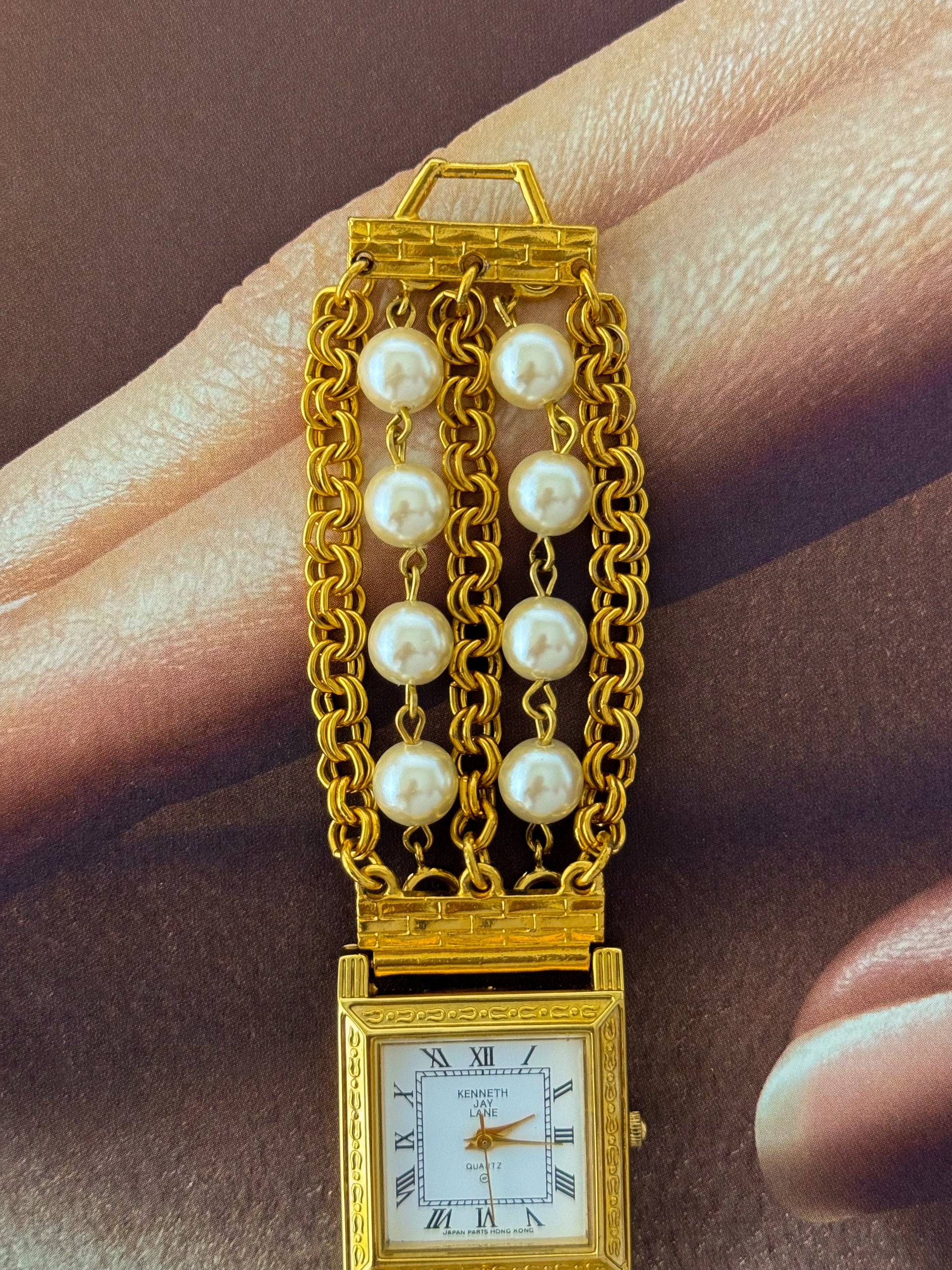 Vintage Kenneth Jay Lane (KJL) Gold Watch With Pearl Band and Square Case
