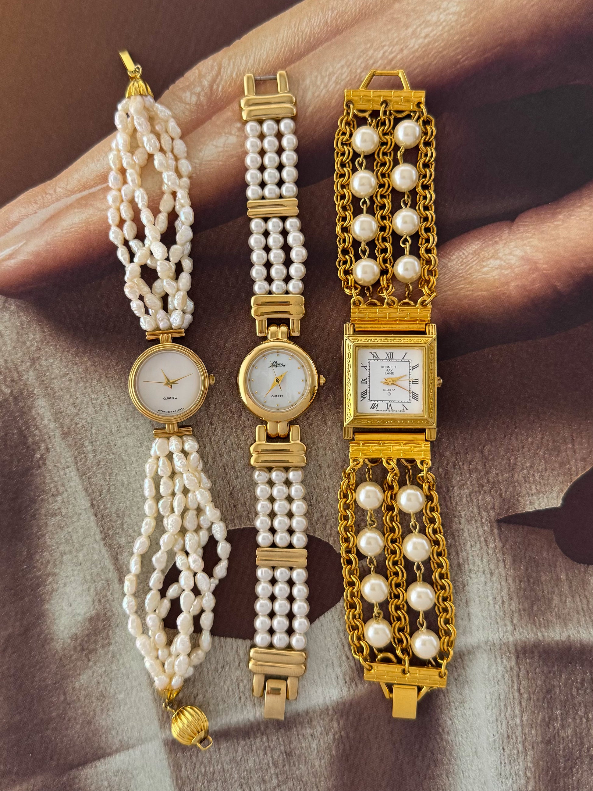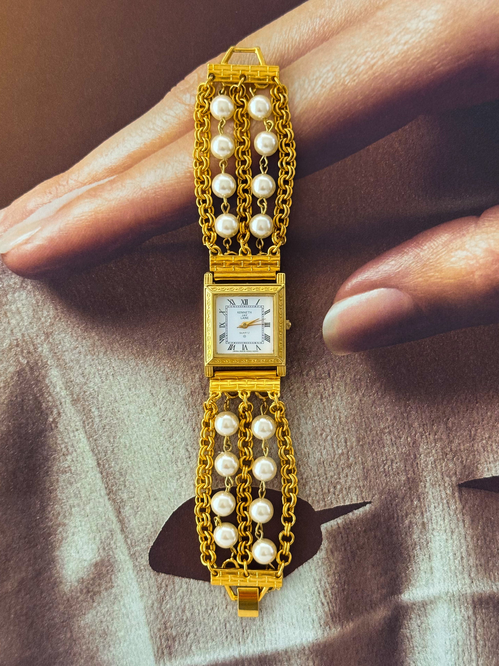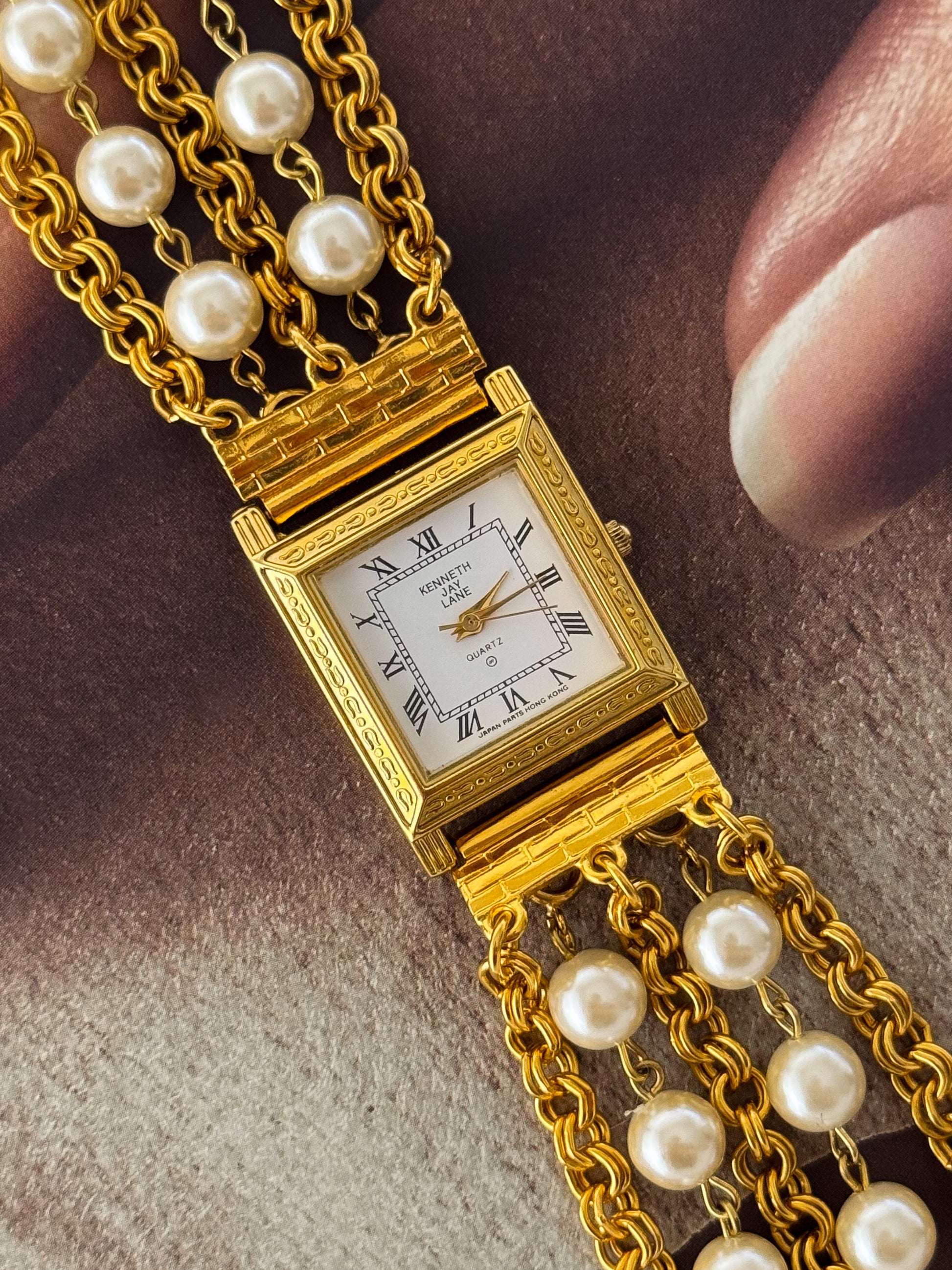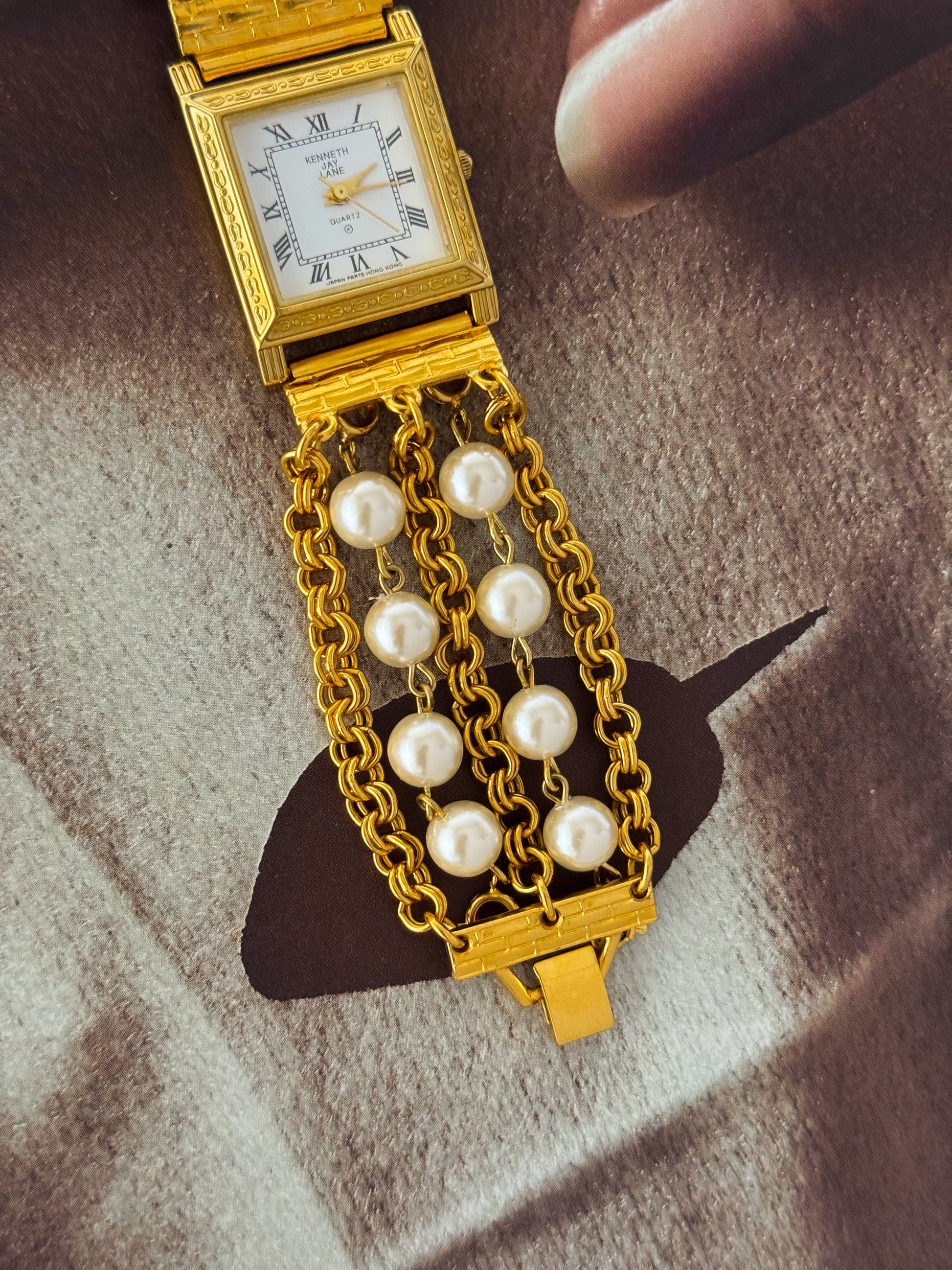 Vintage Kenneth Jay Lane (KJL) Gold Watch With Pearl Band and Square Case