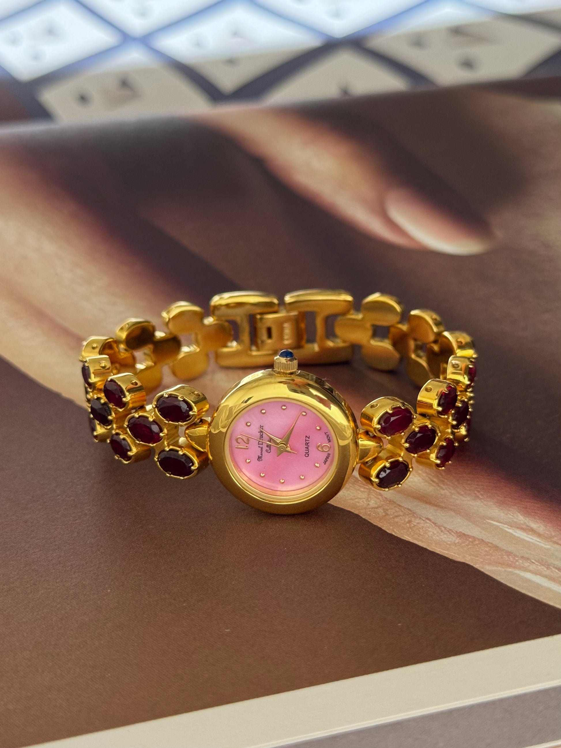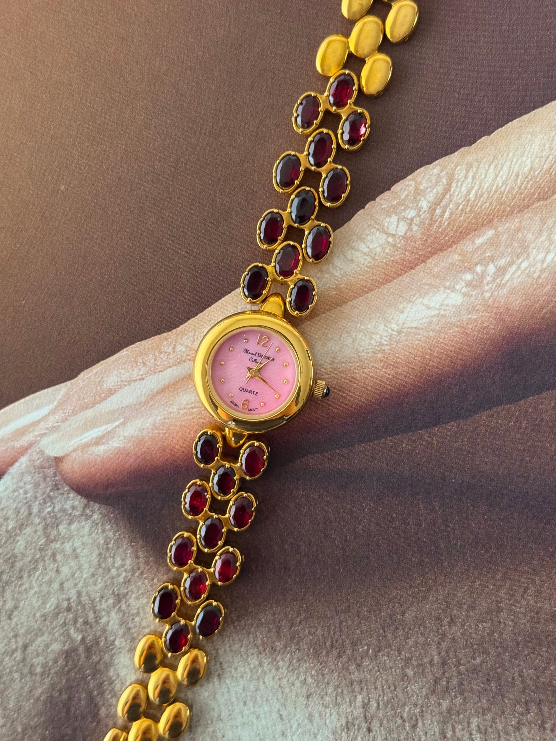 Vintage Marcel Drucker Watch With Pink Dial and Garnet Stone Band